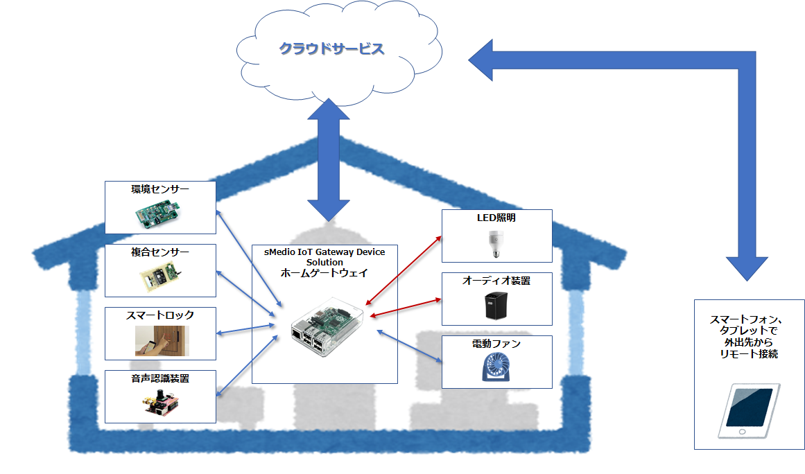 sMedio IoT Gateway Device Solution は、スマートホーム、スマートオフィスなど、異なる無線ネットワーク・通信規格が混在する環境でも、各機器の相互接続やクラウドサービスへのデータ送信を可能にする組み込み用ソフトウェア群です。今回のデモでは、BLE対応機器とWi-Fi対応機器の相互接続、およびゲートウェイ内蔵 UIによる、タッチ操作でのリモート操作を実現しています。